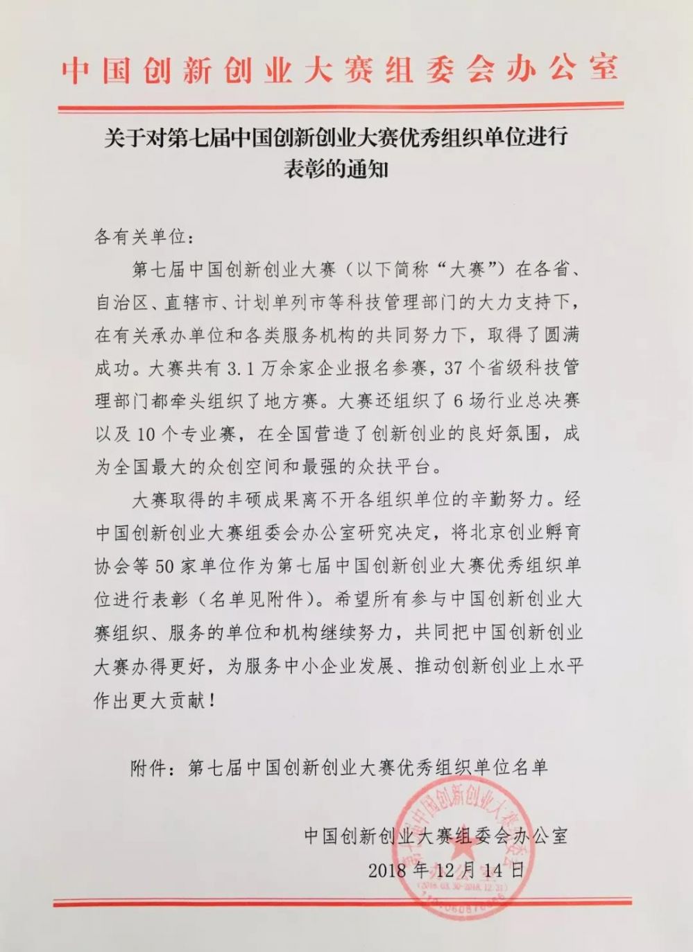 12月14日,集團(tuán)被中國創(chuàng)新創(chuàng)業(yè)大賽組委會(huì)授予“第七屆中國創(chuàng)新創(chuàng)業(yè)大賽優(yōu)秀組織單位”。