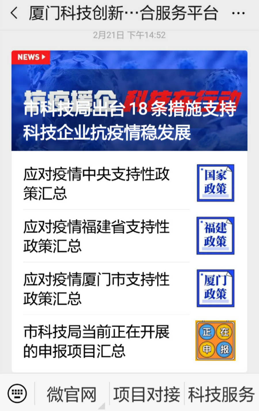 新型冠狀病毒肺炎疫情來(lái)勢(shì)洶洶,中小微企業(yè)經(jīng)營(yíng)生產(chǎn)遭受嚴(yán)重影響,國(guó)家、省、市密集出臺(tái)了多項(xiàng)抗疫援企的政策舉措,幫助企業(yè)共渡難關(guān)。作為廈門市首家科技服務(wù)“一站式”公共服務(wù)平臺(tái)——廈門科技創(chuàng)新創(chuàng)業(yè)綜合服務(wù)平臺(tái)的運(yùn)營(yíng)單位,廈門科技交流中心在市科技局、科技集團(tuán)的指導(dǎo)下,體現(xiàn)科技服務(wù)特色,利用微信公眾號(hào)及時(shí)向企業(yè)推送政策信息。一是率先推出科技抗疫18條措施咨詢方式。2月13日,市科技局發(fā)布了《關(guān)于全力支持科技企業(yè)抗疫情穩(wěn)發(fā)展的若干措施》,企業(yè)如何兌現(xiàn)這些幫扶措施,交流中心急企業(yè)所需,主動(dòng)對(duì)接市科技局業(yè)務(wù)處室,逐條落實(shí)主管處室和經(jīng)辦人,率先推出18條措施對(duì)應(yīng)的業(yè)務(wù)處室及咨詢電話,獲得市科技局肯定和企業(yè)好評(píng)。二是及時(shí)推出市科技局申報(bào)項(xiàng)目匯總。疫情期間諸多科技項(xiàng)目申報(bào)延期的情況,為方便企業(yè)及時(shí)了解各項(xiàng)申報(bào)信息,交流中心以申報(bào)截止時(shí)間為序,逐一梳理市科技局目前正在開(kāi)展的科技項(xiàng)目,推送信息一經(jīng)發(fā)布即獲得大量轉(zhuǎn)發(fā),反響顯著。三是推出應(yīng)對(duì)疫情支持性政策匯總。逐一梳理中央、福建省、廈門市應(yīng)對(duì)疫情出臺(tái)的各項(xiàng)政策舉措,形成政策原文匯總,方便企業(yè)了解、查詢。下一步,科技交流中心還將依托科技創(chuàng)新創(chuàng)業(yè)綜合服務(wù)平臺(tái),探索網(wǎng)絡(luò)直播政策解讀等方式,服務(wù)企業(yè),服務(wù)創(chuàng)新,服務(wù)發(fā)展。
