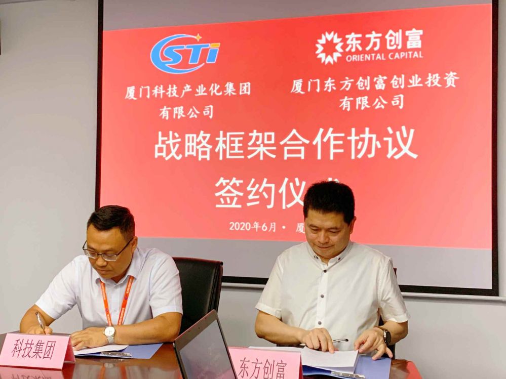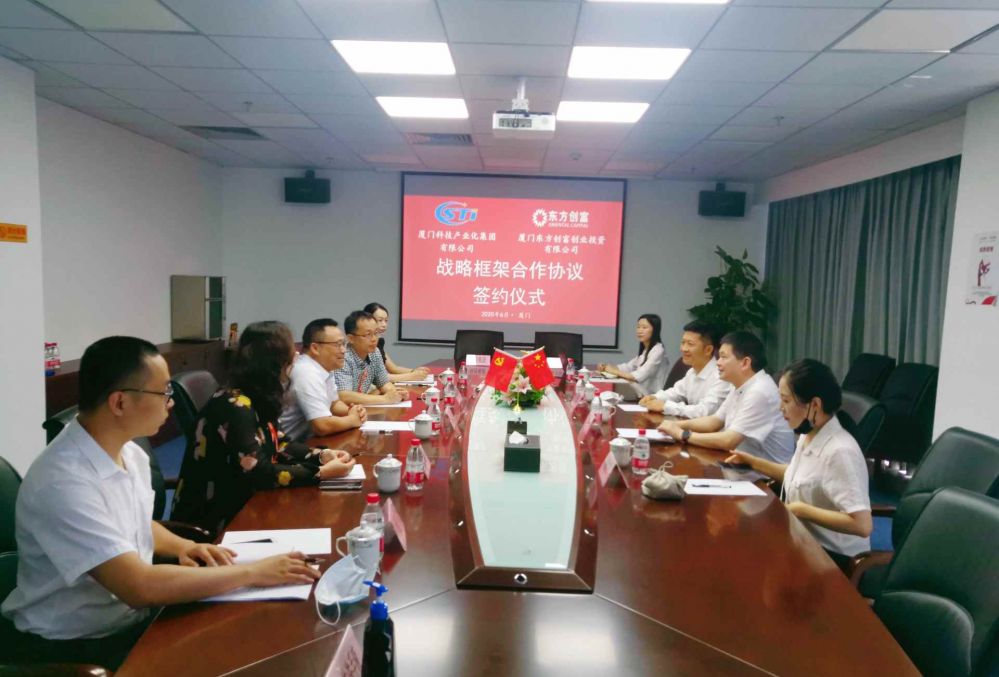 6月16日上午,廈門科技產(chǎn)業(yè)化集團(tuán)有限公司(以下簡稱“科技集團(tuán)”)與廈門東方創(chuàng)富創(chuàng)業(yè)投資有限公司(以下簡稱“東方創(chuàng)富”)就共同創(chuàng)立啟航創(chuàng)富【未來科技】投資基金在科技集團(tuán)總部舉行戰(zhàn)略合作簽約儀式??萍技瘓F(tuán)黨總支書記、董事長謝勇堅與東方創(chuàng)富董事長呂丹東代表雙方進(jìn)行簽約,科技集團(tuán)常務(wù)副總經(jīng)理方永松、副總經(jīng)理張蕾,東方創(chuàng)富副總經(jīng)理李榮源等共同出席簽約儀式。