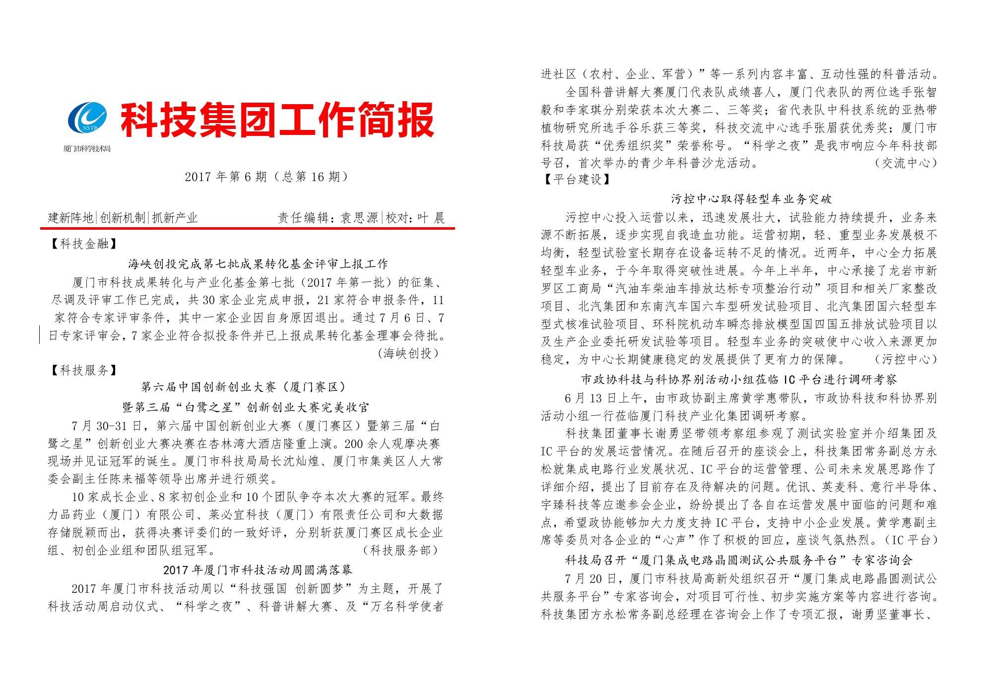 產(chǎn)業(yè)化公司工作簡(jiǎn)報(bào)第6期(總第16期) 欄目:集團(tuán)資訊 來(lái)源:廈門科技產(chǎn)業(yè)化集團(tuán) 時(shí)間:2017-09-28 熱度:172