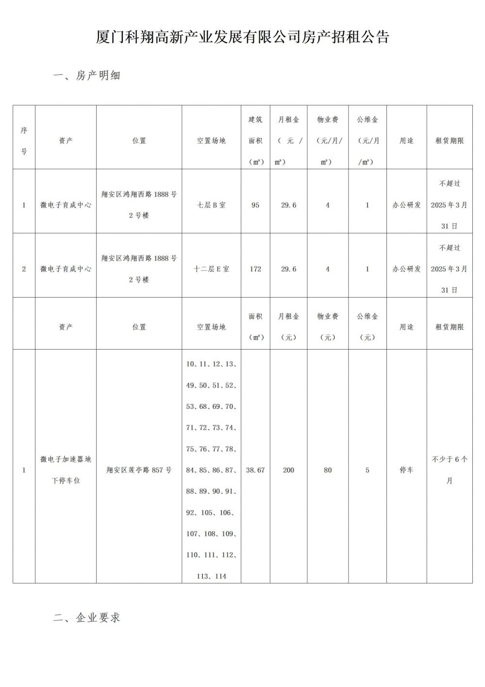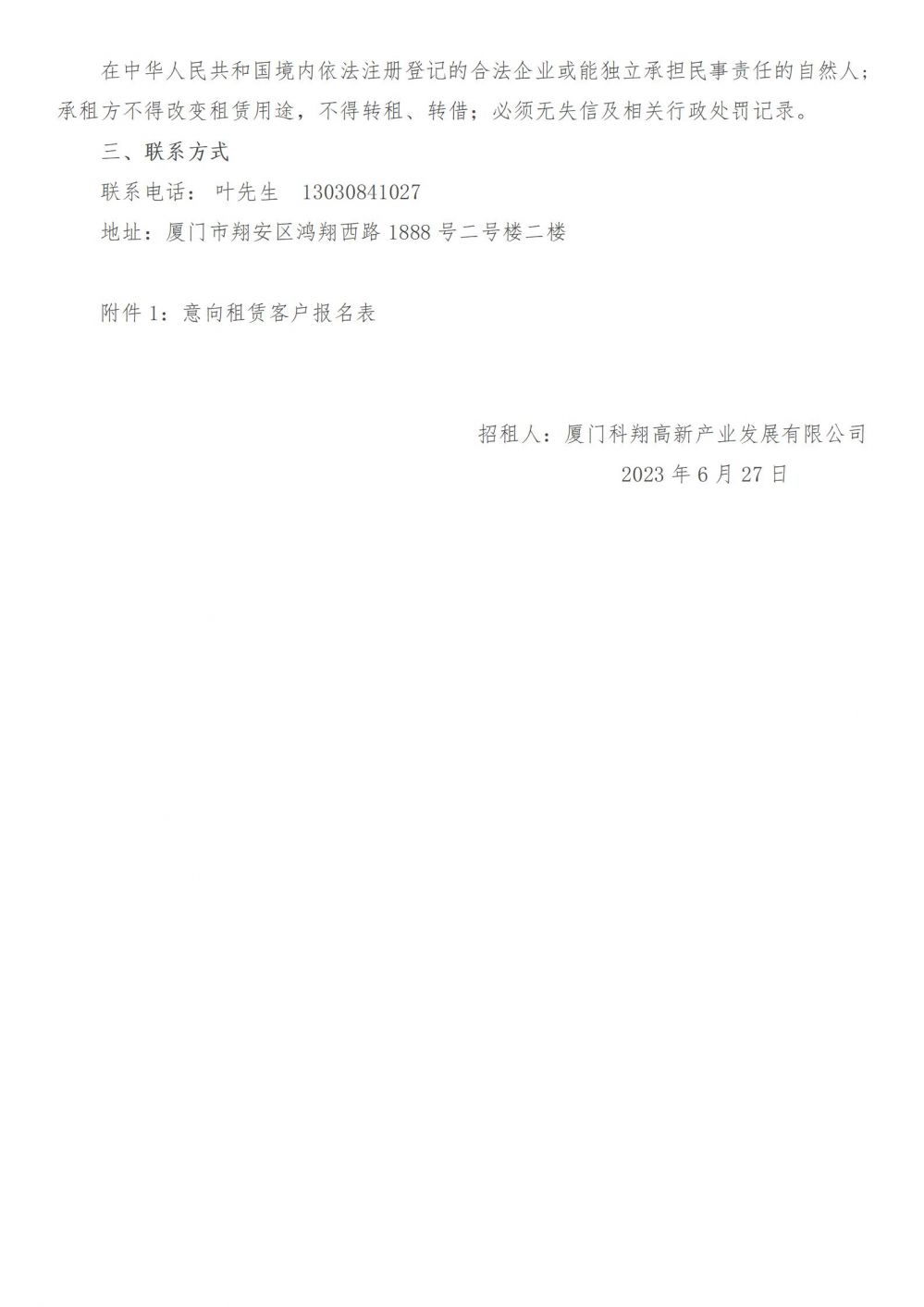 廈門科翔高新產(chǎn)業(yè)發(fā)展有限公司房產(chǎn)招租公告 欄目:通知公告 來源:廈門科技產(chǎn)業(yè)化集團(tuán) 時間:2023-06-28 熱度:206 廈門科翔高新產(chǎn)業(yè)發(fā)展有限公司房產(chǎn)招租公告2023.6.27.docx