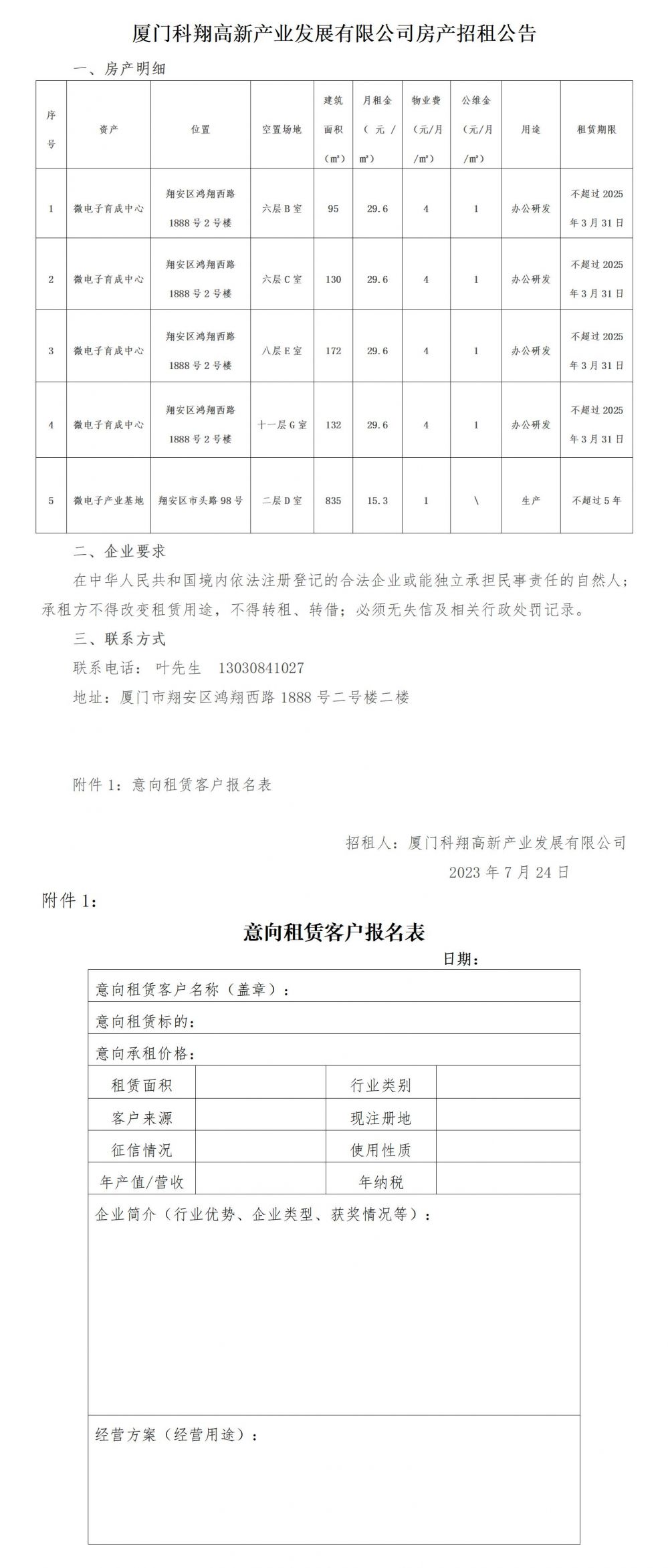 廈門科翔高新產(chǎn)業(yè)發(fā)展有限公司房產(chǎn)招租公告 欄目:通知公告 來源:廈門科技產(chǎn)業(yè)化集團 時間:2023-08-02 熱度:184 廈門科翔高新產(chǎn)業(yè)發(fā)展有限公司房產(chǎn)招租公告2023.7.24.doc