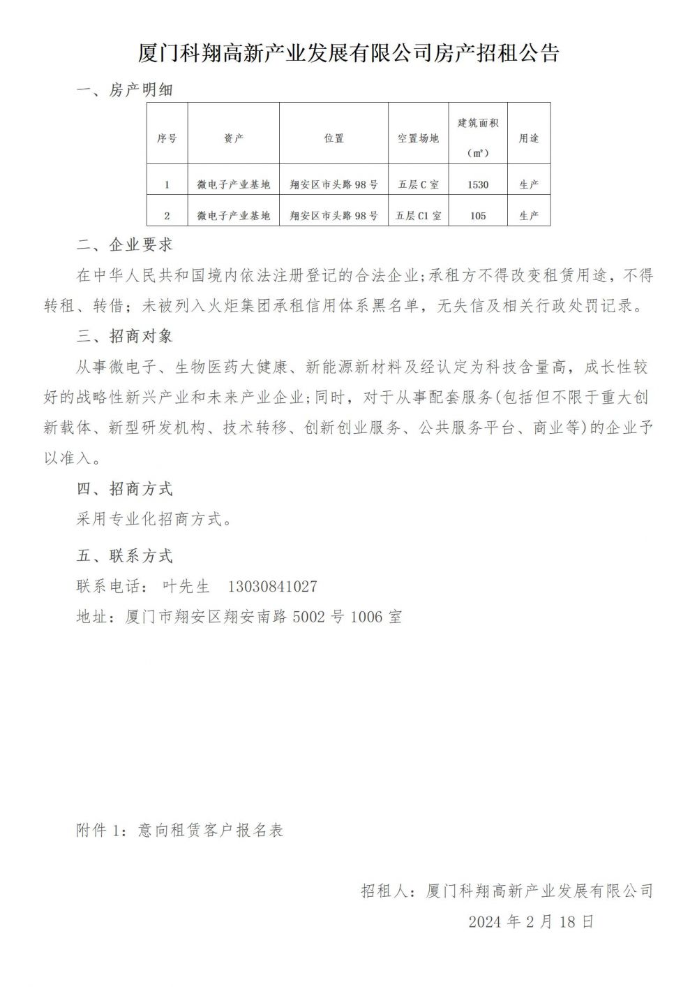 廈門科翔高新產(chǎn)業(yè)發(fā)展有限公司房產(chǎn)招租公告