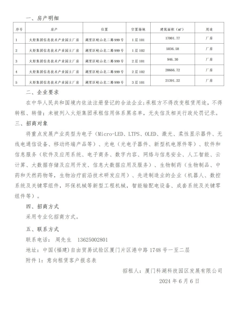廈門科湖科技園區(qū)發(fā)展有限公司房產招租公告