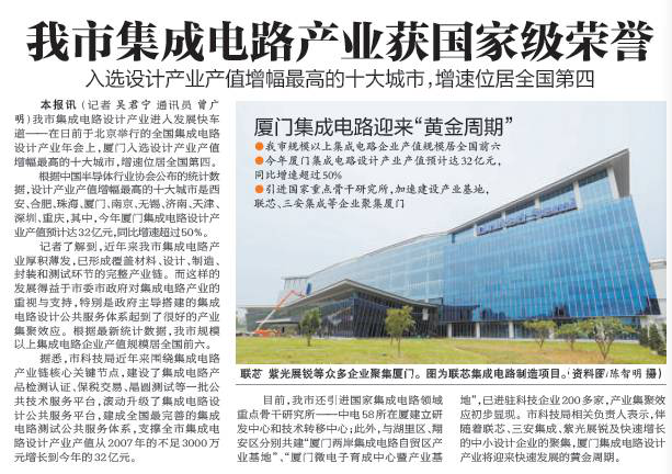 在全國集成電路設計產(chǎn)業(yè)年會上,廈門入選設計產(chǎn)業(yè)增幅最高的十大城市,增速位居全國第四。